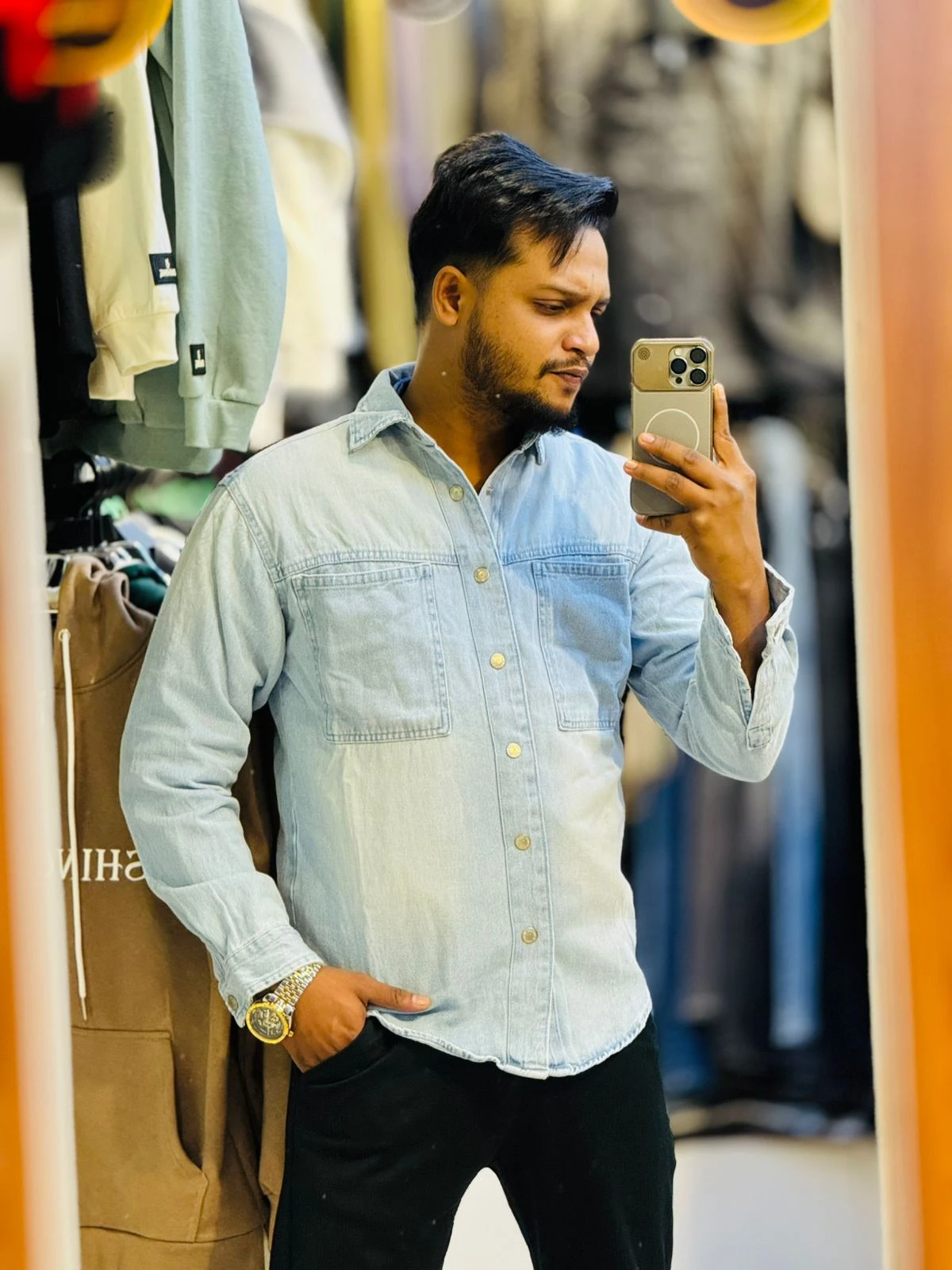 Elevate your casual game with this versatile and effortlessly cool denim shirt. Designed for comfort and timeless style, it's the perfect essential for any modern wardrobe.