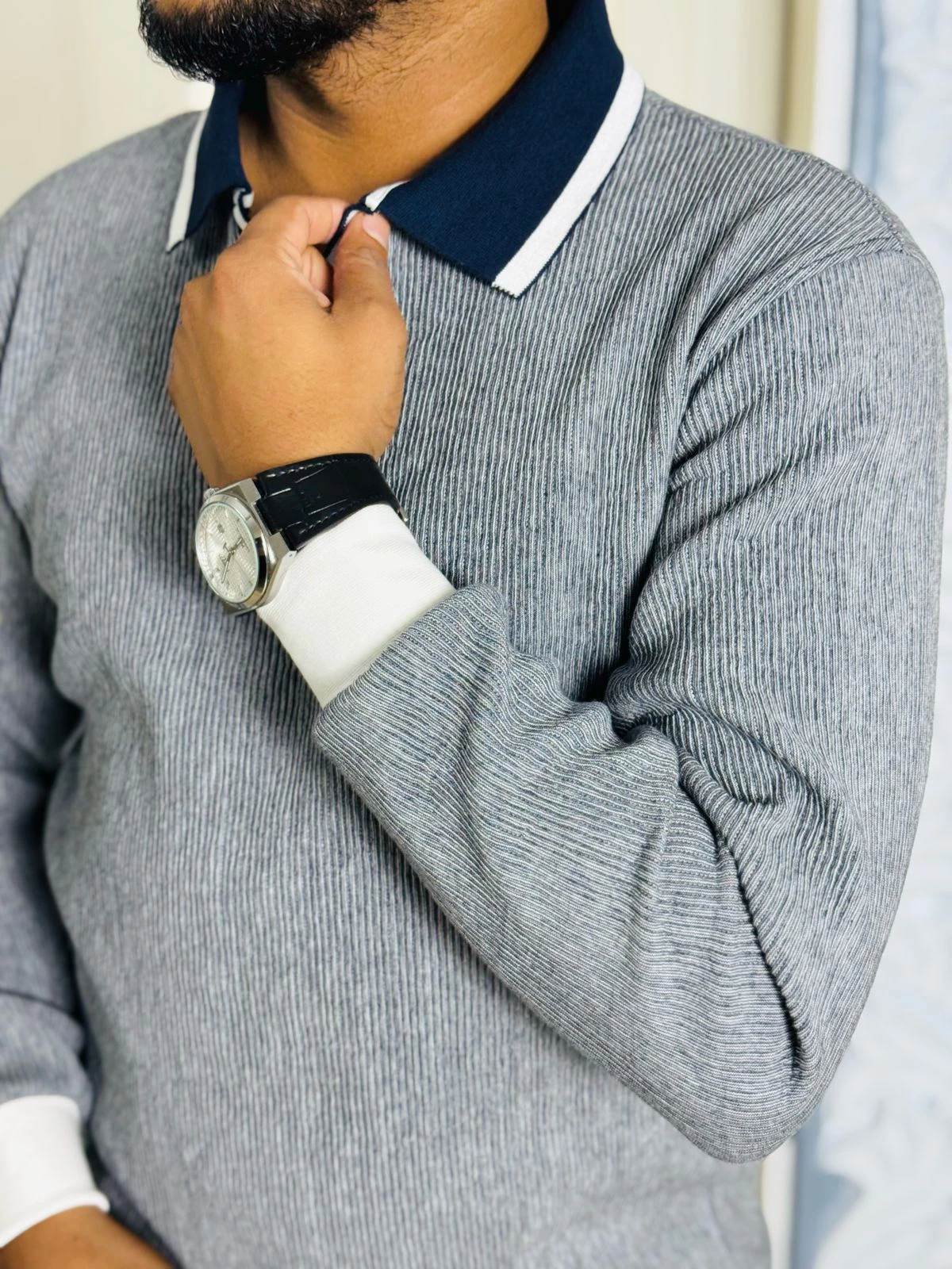 • Secondary Keywords: Quiet Luxury Fashion, Men's Striped Polo, Long Sleeve Knitwear, Timeless Style, Winter Fashion, Premium Polo Knit.