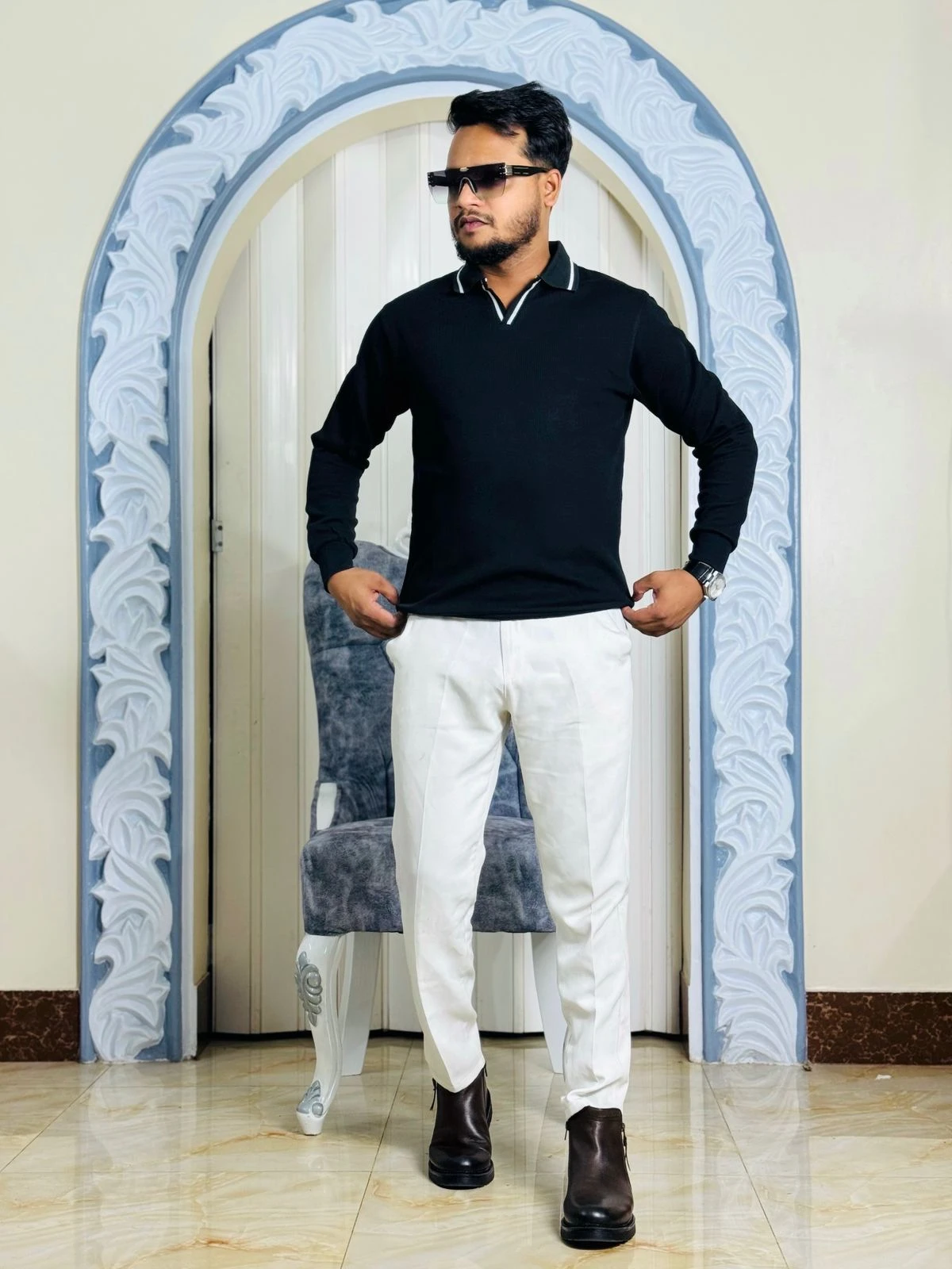 • Black V-Neck Polo: Minimalist sophistication, creating a clean and crisp foundation for any outfit.