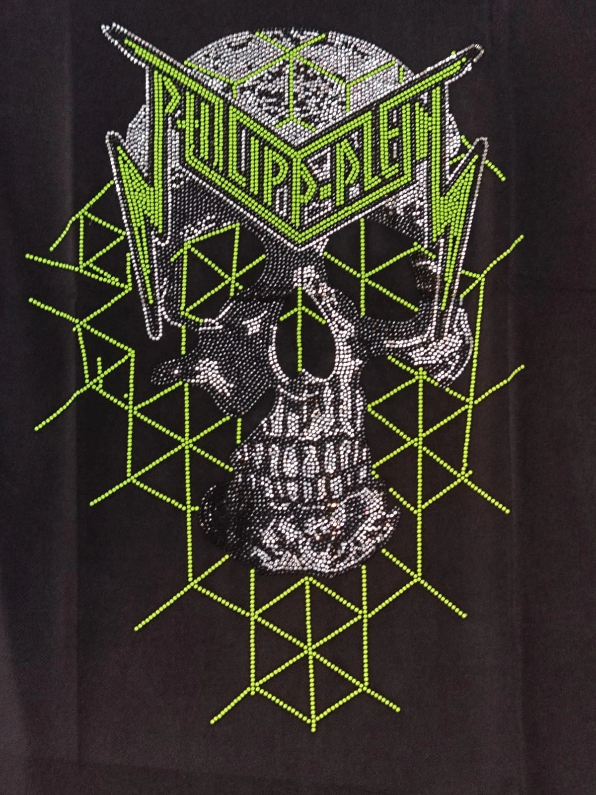 It features a finely crafted skull design made with reflective micro-stones that subtly shimmer under light, paired with a sleek green geometric grid for a unique edge.