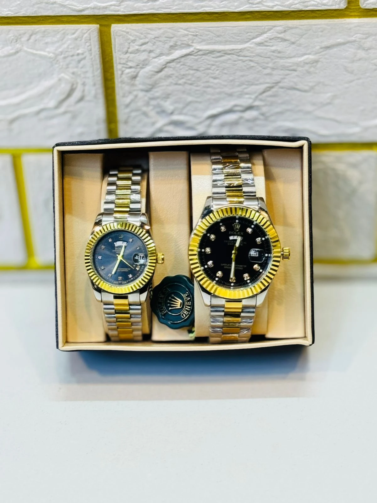 The Rolex Luxury Two-Tone Couple Set is designed for the pair that moves through life with grace and ambition. Wear your success together and let your wrists tell a story of luxury, precision, and everlasting partnership.