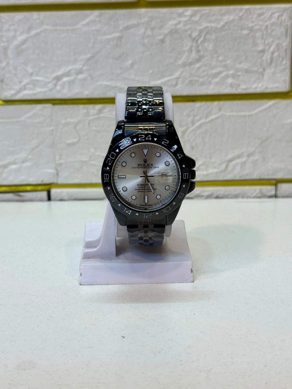 Elevate your wrist game with this striking Rolex Oyster Perpetual Date Submariner. Featuring a bold all-black casing paired with a sophisticated silver sunray dial, this timepiece is the perfect blend of rugged durability and high-end luxury.