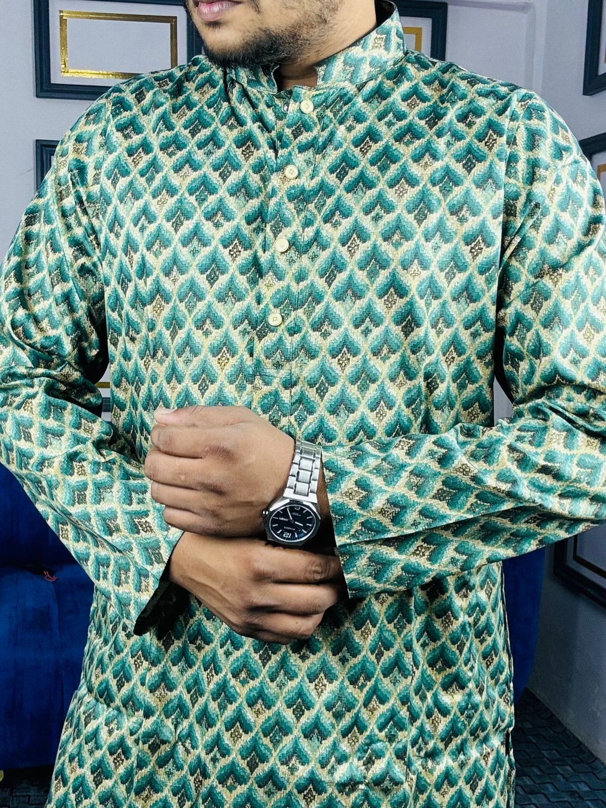 Embrace the essence of heritage with our Royal Ethnic Printed Panjabi. This piece is a celebration of intricate artistry, featuring a rich tapestry of digital prints that blend deep teal tones with hints of crimson and charcoal. Perfect for those who want to make a bold yet sophisticated statement at any festive occasion.