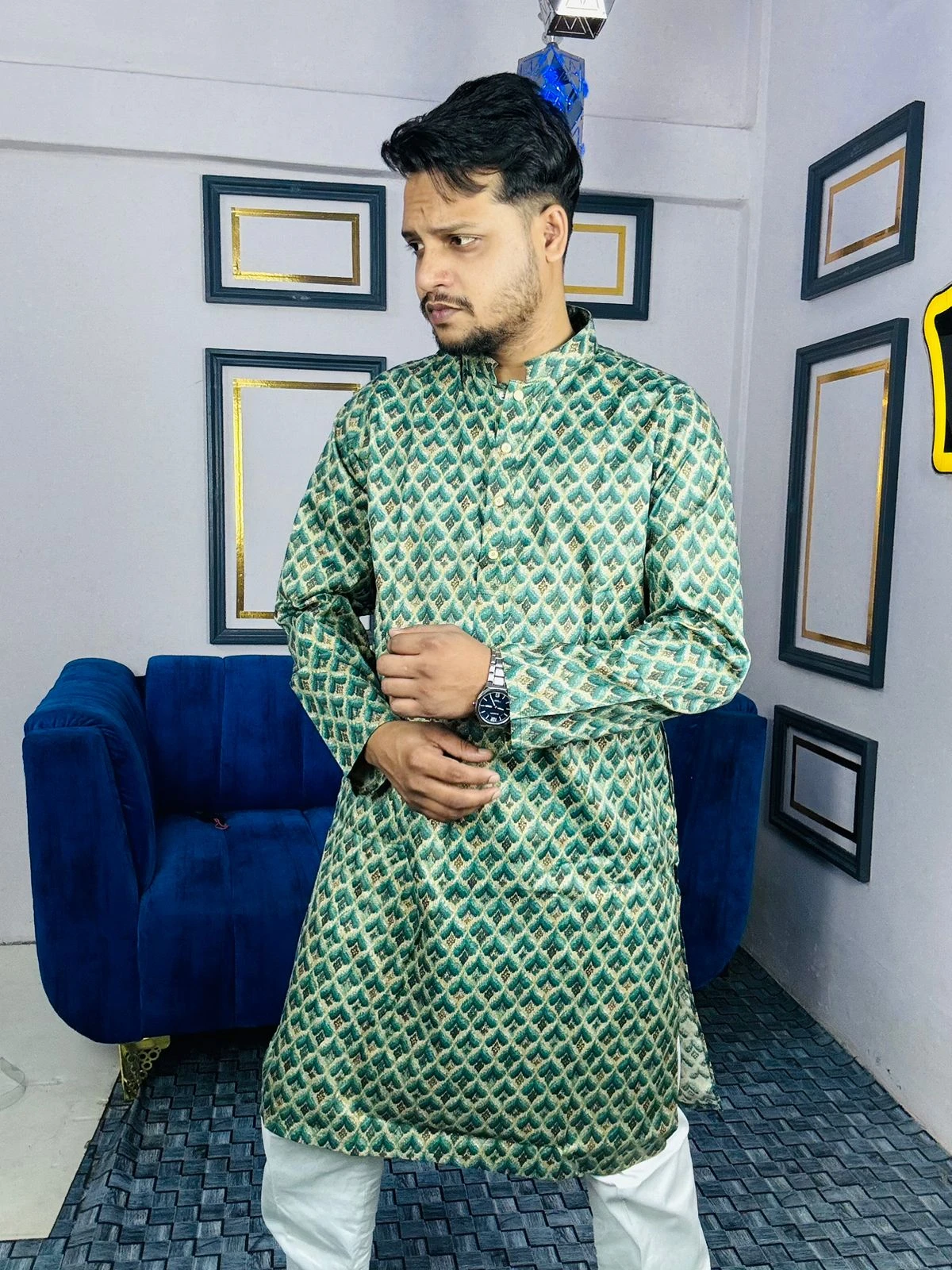 Pair this masterpiece with a white or off-white pajama and traditional loafers (Nagras) to complete your royal ethnic ensemble.