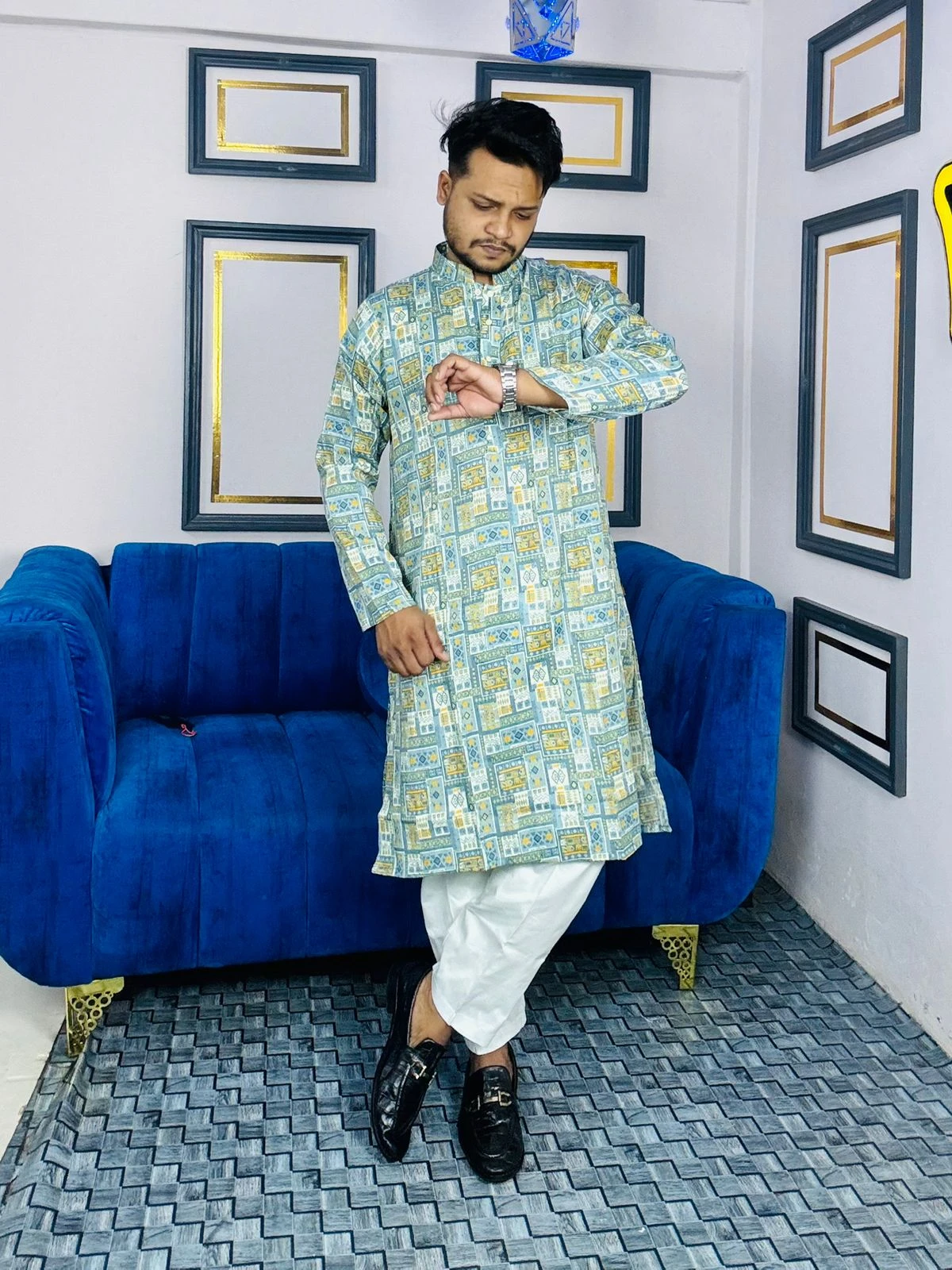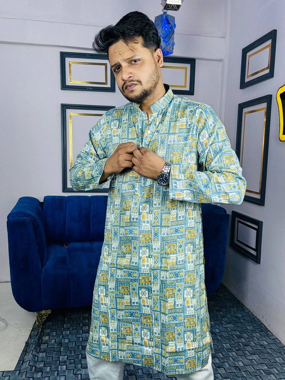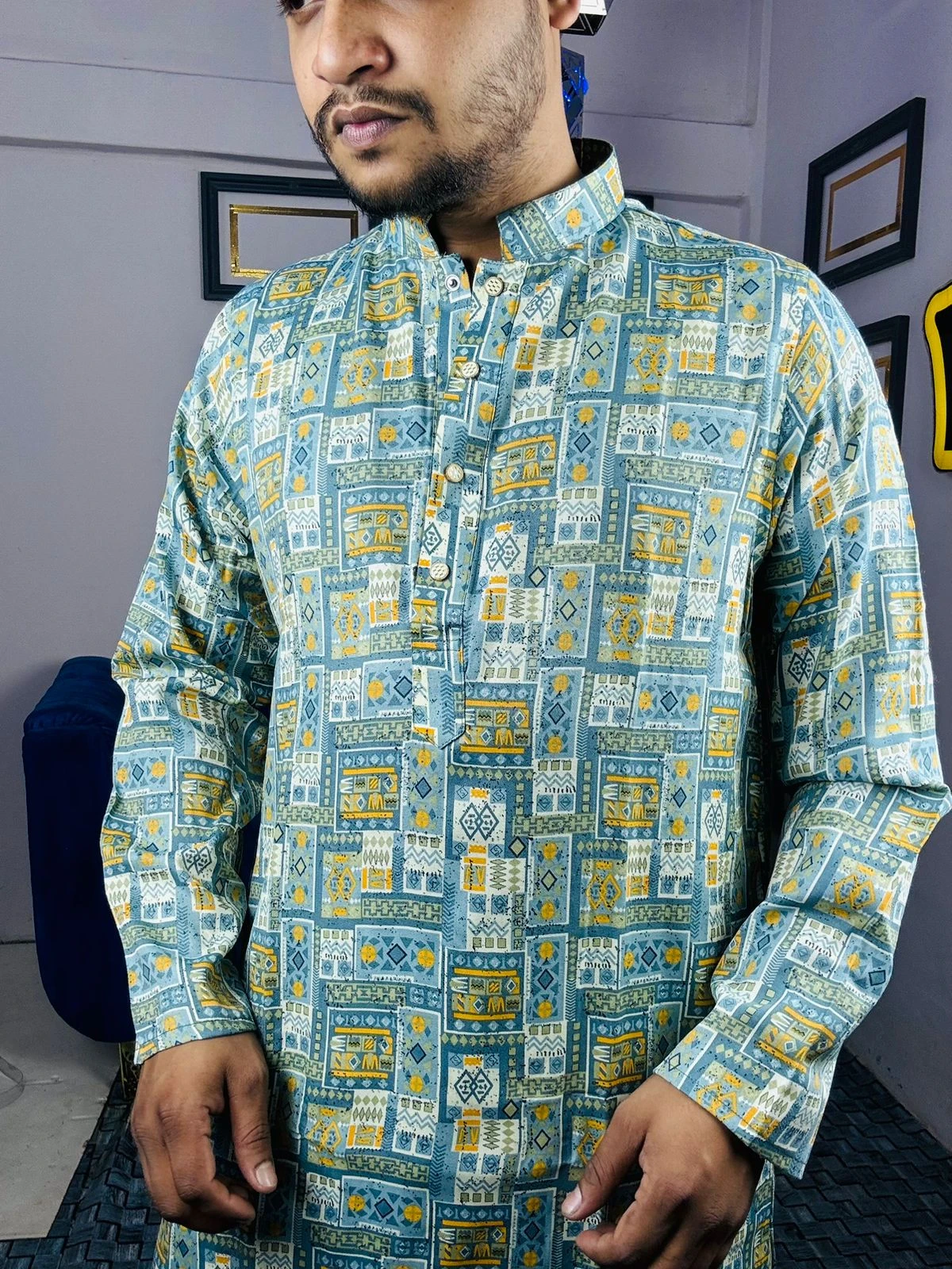 Embrace the essence of heritage with our Royal Ethnic Printed Panjabi. This piece is a celebration of intricate artistry, featuring a rich tapestry of digital prints that blend deep teal tones with hints of crimson and charcoal. Perfect for those who want to make a bold yet sophisticated statement at any festive occasion.