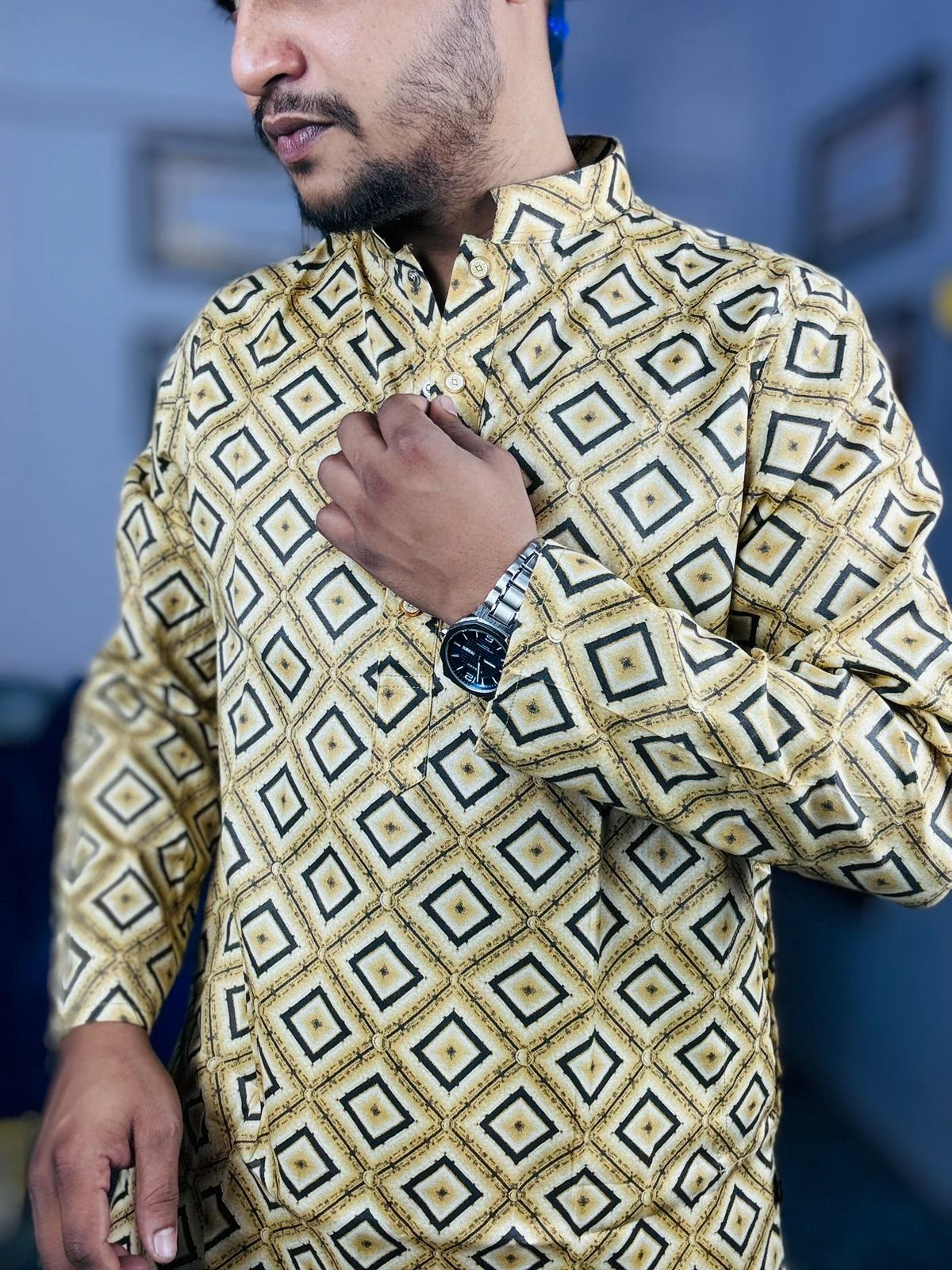 Royal Ethnic Printed Panjabi - Mustard Gold