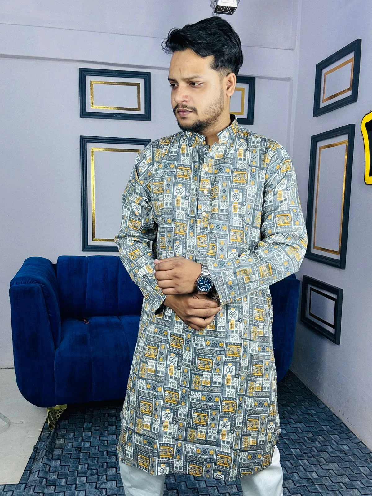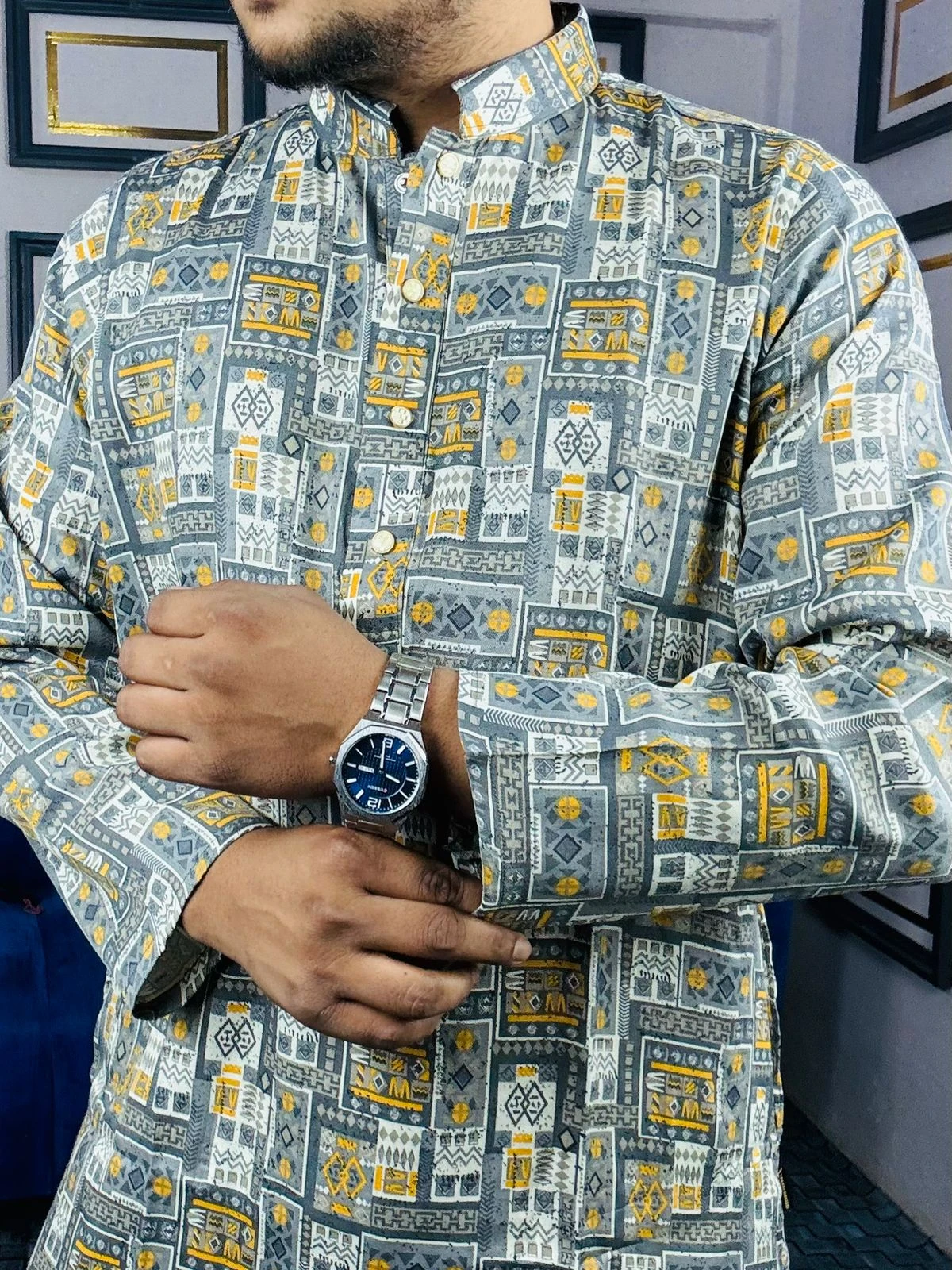Embrace the essence of heritage with our Royal Ethnic Printed Panjabi. This piece is a celebration of intricate artistry, featuring a rich tapestry of digital prints that blend deep teal tones with hints of crimson and charcoal. Perfect for those who want to make a bold yet sophisticated statement at any festive occasion.