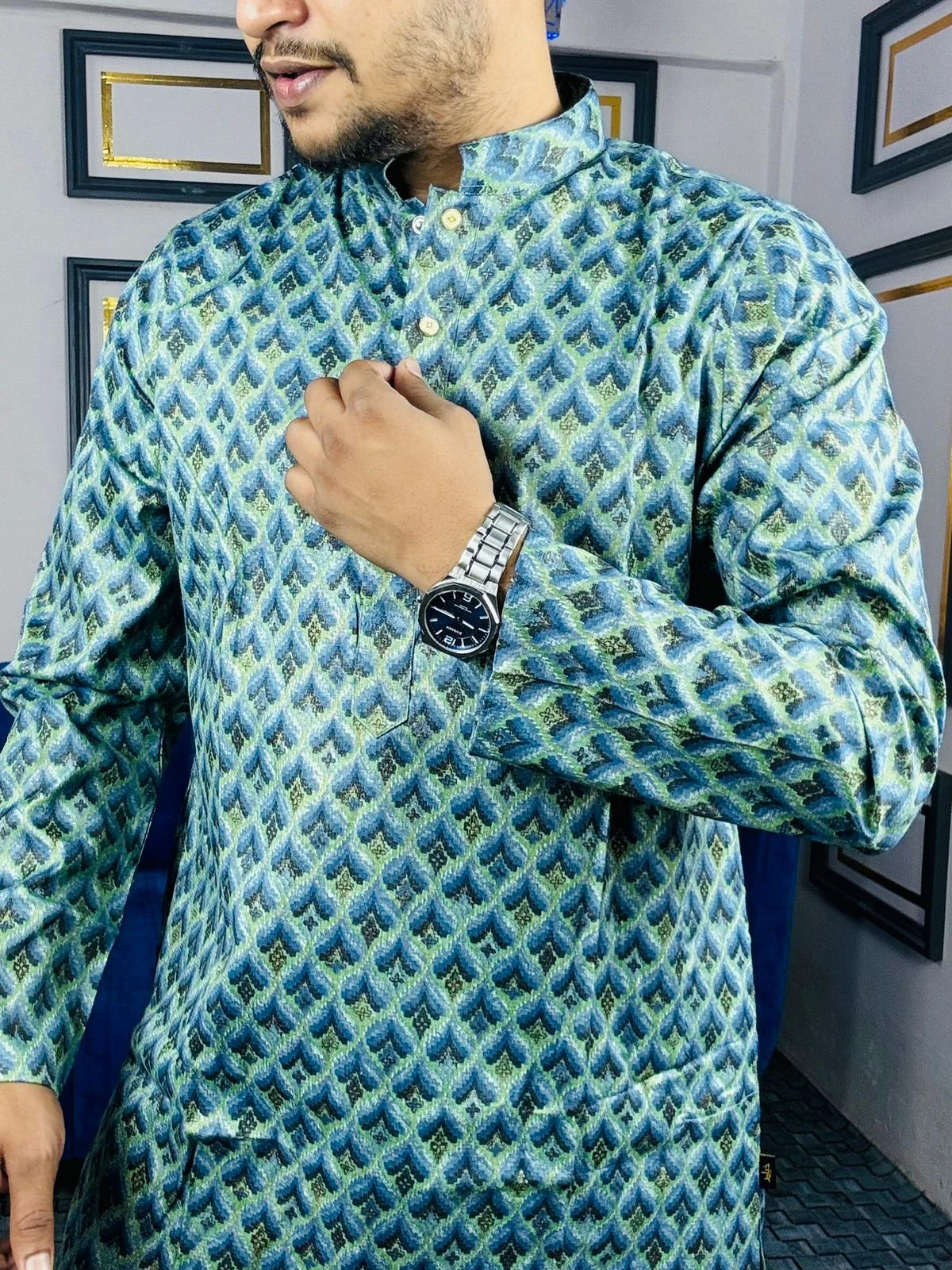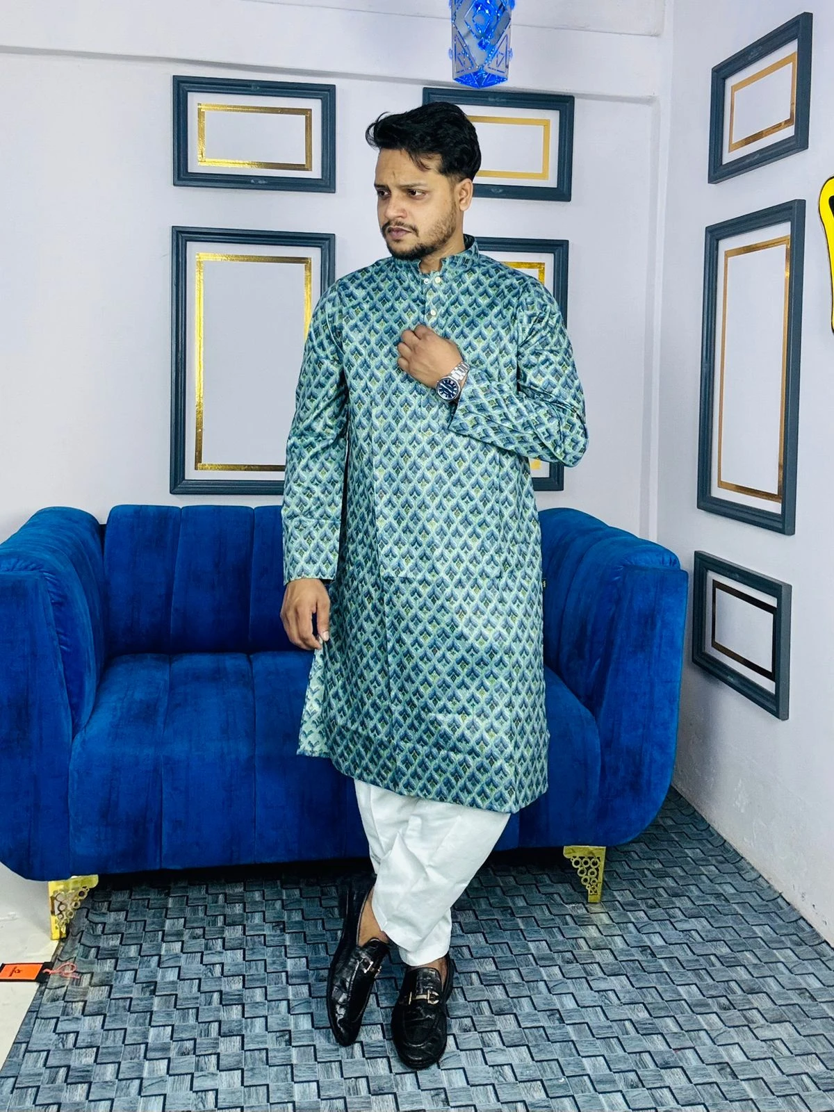 Embrace the essence of heritage with our Royal Ethnic Printed Panjabi. This piece is a celebration of intricate artistry, featuring a rich tapestry of digital prints that blend deep teal tones with hints of crimson and charcoal. Perfect for those who want to make a bold yet sophisticated statement at any festive occasion.