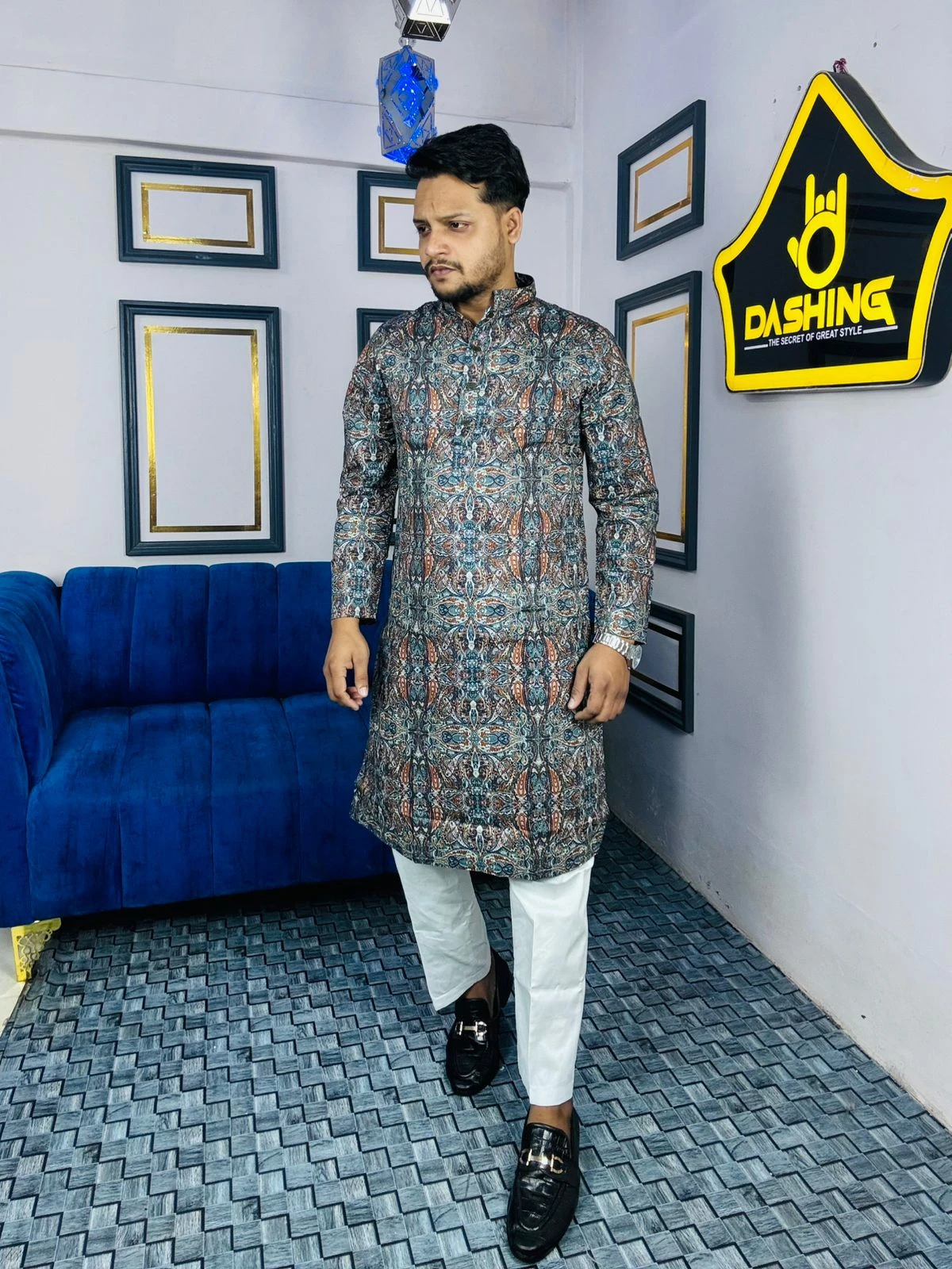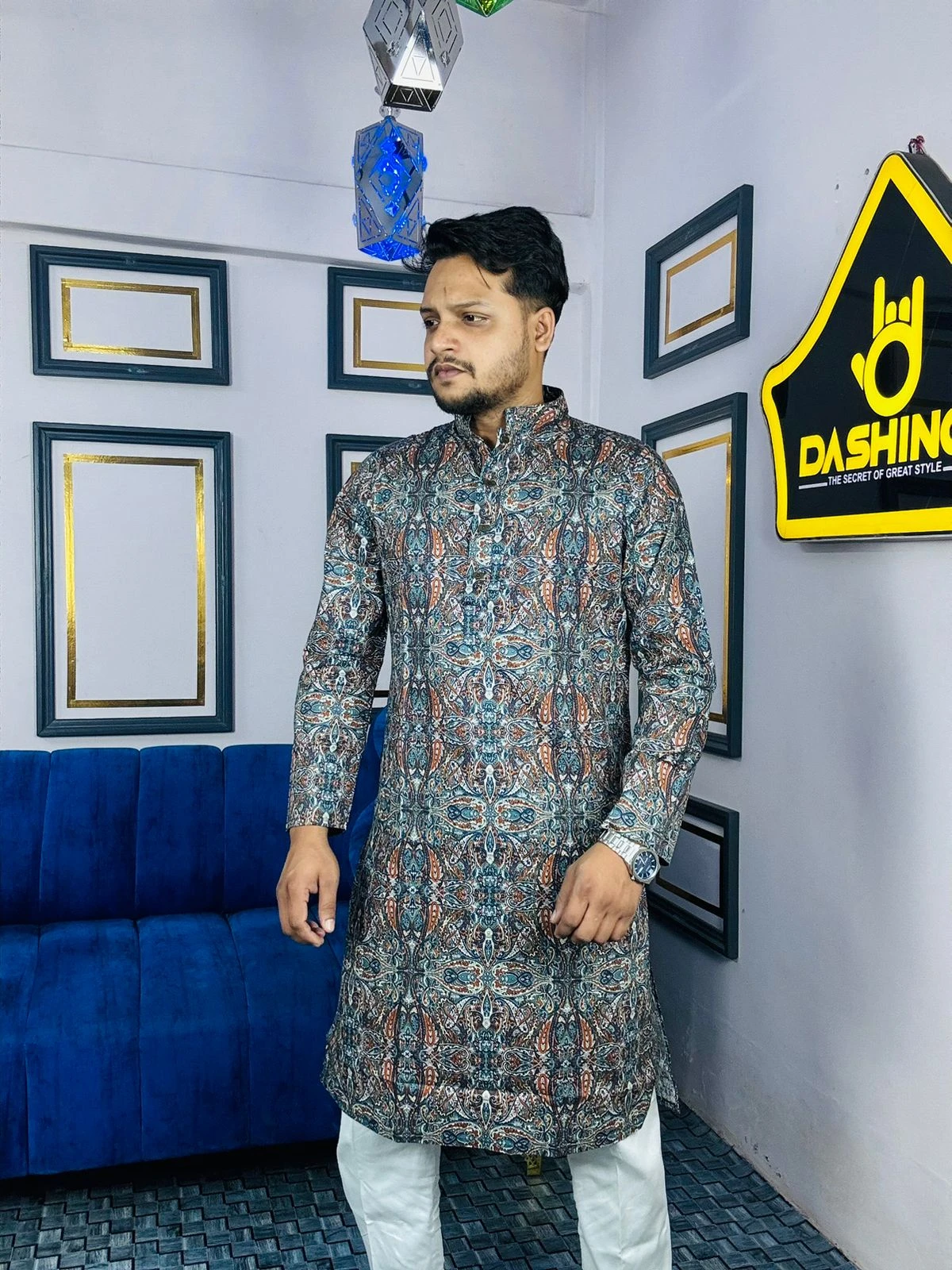 Embrace the essence of heritage with our Royal Ethnic Printed Panjabi. This piece is a celebration of intricate artistry, featuring a rich tapestry of digital prints that blend deep teal tones with hints of crimson and charcoal. Perfect for those who want to make a bold yet sophisticated statement at any festive occasion.