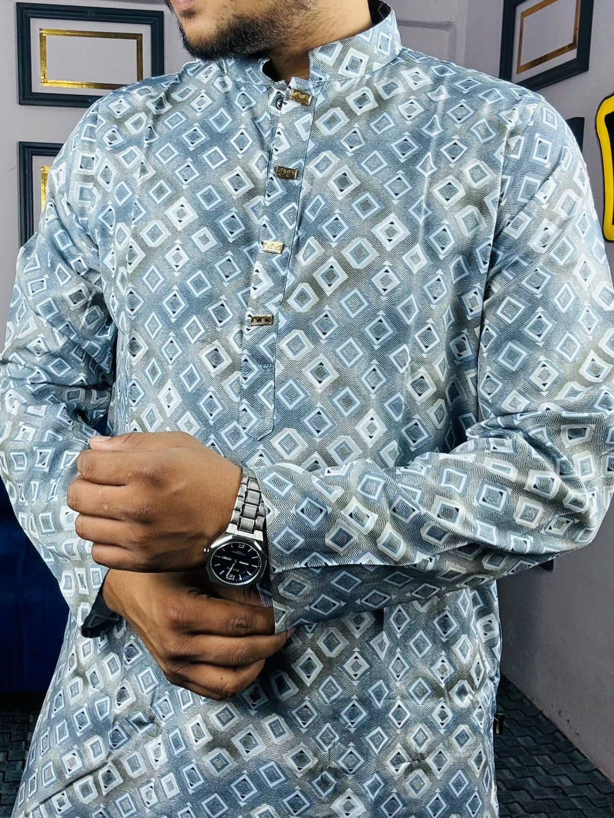 Embrace the essence of heritage with our Royal Ethnic Printed Panjabi. This piece is a celebration of intricate artistry, featuring a rich tapestry of digital prints that blend deep teal tones with hints of crimson and charcoal. Perfect for those who want to make a bold yet sophisticated statement at any festive occasion.