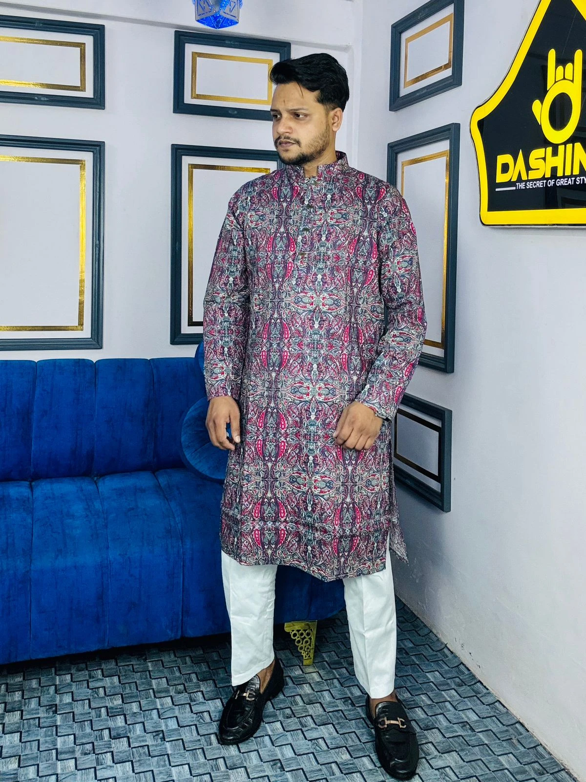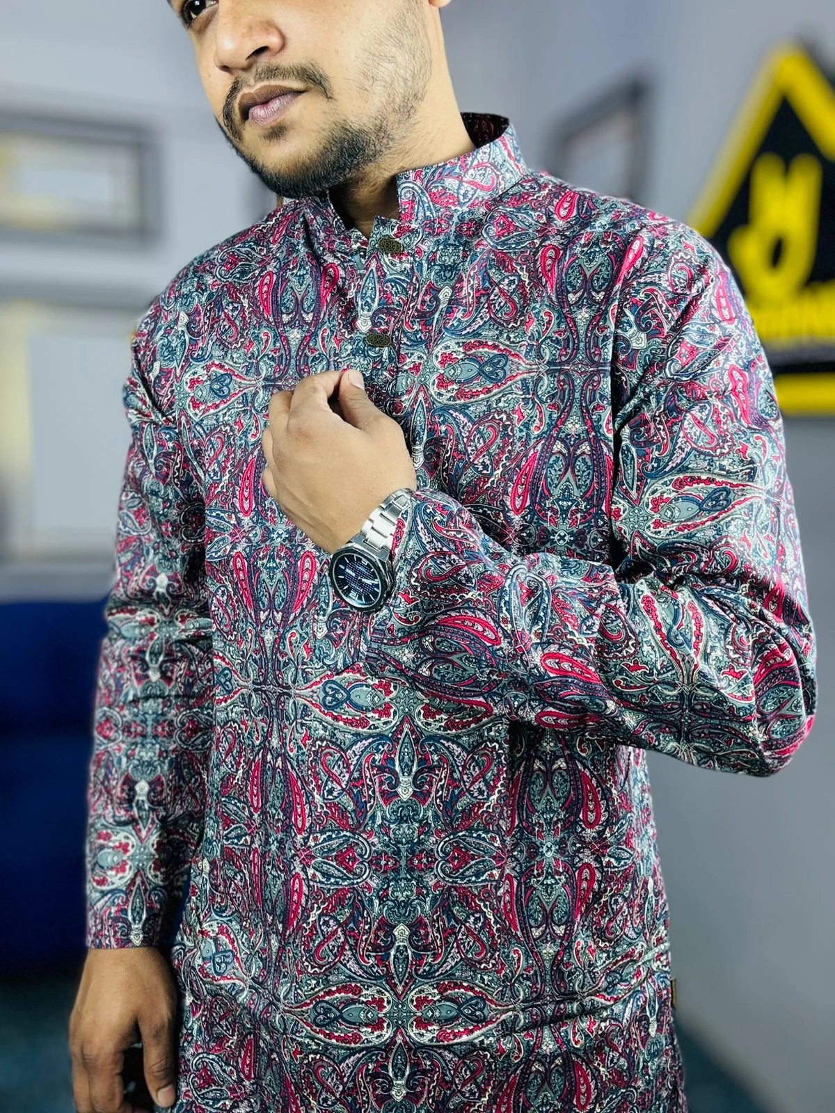 Embrace the essence of heritage with our Royal Ethnic Printed Panjabi. This piece is a celebration of intricate artistry, featuring a rich tapestry of digital prints that blend deep teal tones with hints of crimson and charcoal. Perfect for those who want to make a bold yet sophisticated statement at any festive occasion.