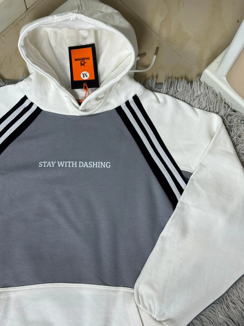 "The perfect blend of comfort and street style. This color-block hoodie features classic white raglan sleeves accented by bold three-line black stripes. Made with soft fleece and finished with the subtle chest print, 'STAY WITH DASHING.' Essential for your daily rotation.".
