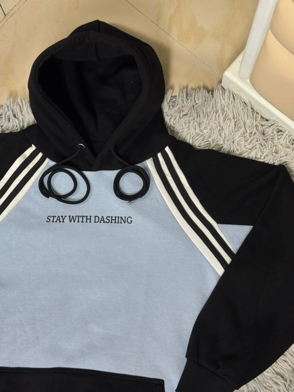 "The perfect blend of comfort and street style. This color-block hoodie features classic white raglan sleeves accented by bold three-line black stripes. Made with soft fleece and finished with the subtle chest print, 'STAY WITH DASHING.' Essential for your daily rotation.".